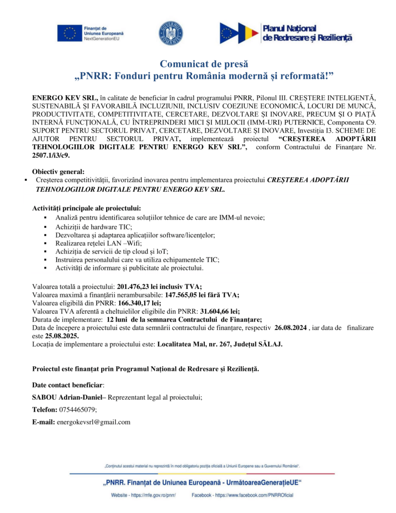 Beneficiara a „PNRR: Fonduri pentru România modernă și reformată!
